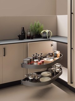 •Under-counter storage options for cookware, pantry items and crockery. Products like Slim Base, Larder Base and Drawer Base feature soft-close runners and smooth pull-out mechanisms, with load capacities of up to 20kg per basket.